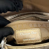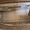 This is an authentic Christian Dior Lady Dior Mini Metallic Lambskin in Gold. This handbag is crafted of lambskin leather. The shoulder bag features rolled leather handles, an optional silver chain strap with a leather shoulder pad, and silver hardware and a hanging “Dior" letters. The top is secured by an interior flap and opens to a fabric interior with a zipper pocket.