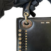 This is an authentic Christian Dior Lady Dior Mini Studded Calfskin in Black. This mini handbag is crafted of calfskin leather. The bag features rolled leather handles, a shoulder strap, silver hardware, and a hanging “Dior" letters charm. The top is secured by an interior flap and opens to a black leather interior with a zipper pocket.