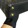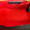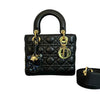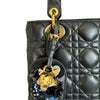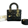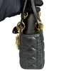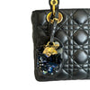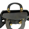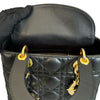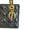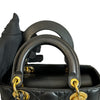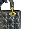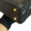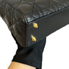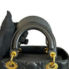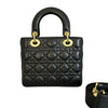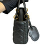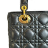 This is an authentic Christian Dior Lady Dior Small Lambskin Cannage in Black. This stylish tote is made of black cannage quilted lambskin leather. It has a wide leather shoulder strap, and strong top handles with gold hardware and Dior logo charms. The top flap reveals a red Dior monogram interior with a zipper pocket.