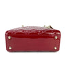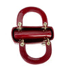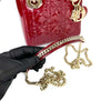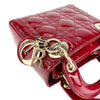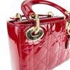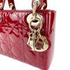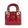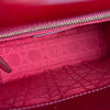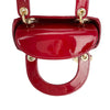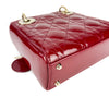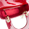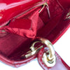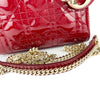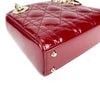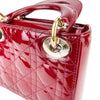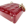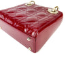 This Christian Dior Cannage Quilted Mini Lady Dior in Cherry Red is fashioned from geometric quilted patent leather. It has sturdy reinforced leather top handles, with an adjustable and detachable patent leather shoulder strap, and polished gold hardware including large links, eyelets, and a hanging Dior initials charm.