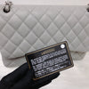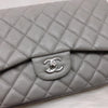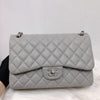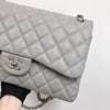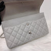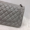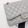 This classic jumbo flap bag is crafted of diamond quilted caviar leather in grey. It features leather threaded polished silver chain link shoulder straps, an exterior rear flat pocket and a front flap with a silver CC turn lock. This opens to a second flap and an interior with flat pockets. This is a perfect shoulder bag for all occasions, from Chanel!