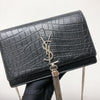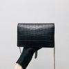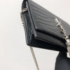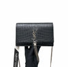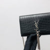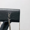 This WOC Classic Monogram Kate Tassel Satchel from Saint Laurent is a stunning piece made from crocodile embossed calfskin leather. It has 6 card slots and 1 coin pocket. It has a ruthenium chain link crossbody shoulder strap and a flap with a ruthenium signature YSL logo.