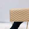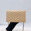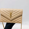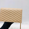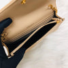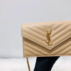 This Small WOC Classic bag from Saint Laurent is a stunning piece made from beige grained calfskin leather. It has 6 card slots and 1 coin pocket. It has a polished gold chain link crossbody shoulder strap and a flap with a polished polished signature YSL logo.
