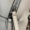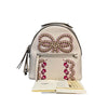 This is an authentic Fendi Liberty Flowers and Bows Backpack Mini Vitello in Off White. This chic mini backpack is made from calfskin leather, adorned with a studded bow and intricate embroidery. It features adjustable shoulder straps, a front zip pocket, and a top zipper that opens to a black interior with a zipper pocket. It's the perfect size for your daily essentials.