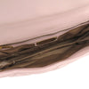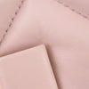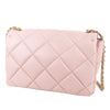 This crossbody bag features a quilted leather body with ribbon detail, a leather woven chain strap, flap top with magnetic snap button closure, and an interior zip pocket.