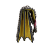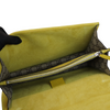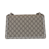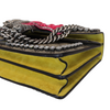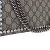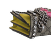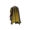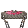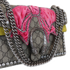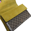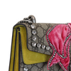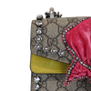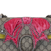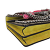 This Dionysus features a coated canvas body with yellow suede leather trim, framed in crystals and topped with a pink bow, ruthenium-tone curb chain straps, a top flap with push lock closure, and an interior zip compartment.