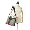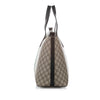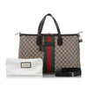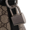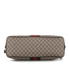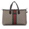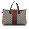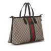 This monogram Gucci satchel features a coated canvas body with leather trim, flat leather handles, a detachable flat leather strap, a top zip closure, and an interior zip pocket.