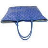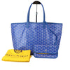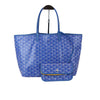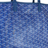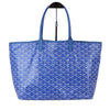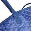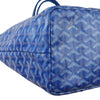 This is an authentic Goyard Goyardine Saint Louis PM in Sky Blue. This Goyard tote is meticulously crafted from coated canvas, adorned with the iconic goyardine chevron monogram in a smaller size, and elegantly accented with blue leather straps and trim. The spacious interior is lined with natural canvas and includes a matching removable pouch.