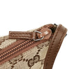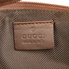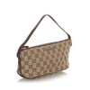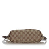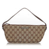 Gucci GG Canvas Boat Baguette Brown. This baguette features a canvas body with leather trim, a flat leather strap, and a top zip closure.