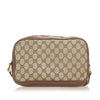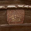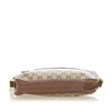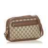 This crossbody bag features a coated canvas body with leather trim, an exterior front zip pocket, a flat leather strap, and a top zip closure.