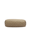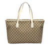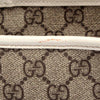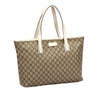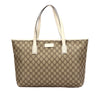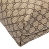Gucci GG Supreme Tote Bag Brown. This tote bag features a coated canvas body, flat leather straps, a top zip closure, and interior slip and zip pockets.