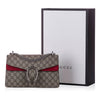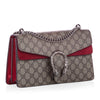 This?ÿGucci?ÿSmall GG Supreme Dionysus features a coated canvas body with suede leather trim, silver-tone curb chain straps, a top flap with push lock closure, and an interior zip compartment.