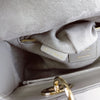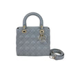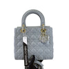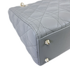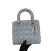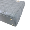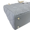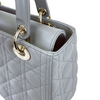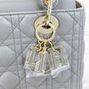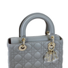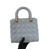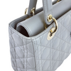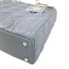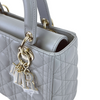 A sleek, feminine style from Diors 2021 collection featuring a top flap closure, the Dior Lady Dior Medium has hallmark soft geometric quilted leather topstitched with the iconic Cannage in grey. The lighb gold signature D.I.O.R. metal jewelry charms with enamel embellishment is feminine and elegant. The sturdy top handles with a long detachable chain make it versatile.