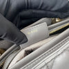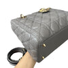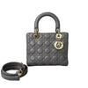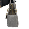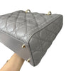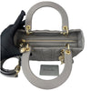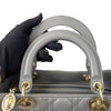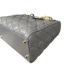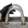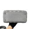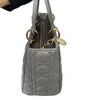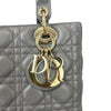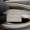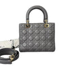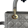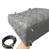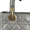 A sleek, feminine style from the iconic brand, the Dior Lady Dior Medium features the hallmark soft geometric quilted leather topstitched with the iconic Cannage in grey. The silver signature D.I.O.R. metal jewelry charms embellish it with feminine elegance, and the sturdy top handles with a long detachable chain make it versatile.