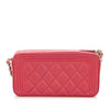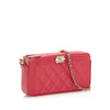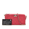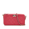 The Chanel Le Boy Lambskin Leather Wallet on Chain Red wallet on chain features a quilted lambskin leather body, a leather woven chain strap, a top zip closure, and interior zip and slip compartments.