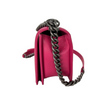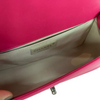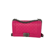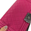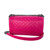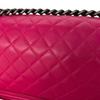 This Chanel Le Boy bag in pink lambskin quilted leather features beautiful ruthenium hardware. The iconic Chanel Boy Bag can be worn either as a shoulder or crossbody bag.
