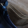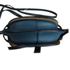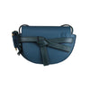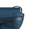 This is an authentic Loewe Mini Gate Crossbody Grained Calfskin in Blue. The stylish crossbody, made of textured blue calfskin leather. It has a shoulder strap and a front flap secured with a knotted detail, adorned with elegant gold hardware. The flap opens up to a brown suede interior with a small patch pocket.