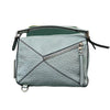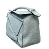 This is an authentic Loewe Puzzle Bag Small Calfskin in Light Blue. Crafted from calfskin leather, this bag showcases a rolled leather handle, an adjustable shoulder strap, and a rear zipper pocket. The top zipper is hidden under a crossover flap with an embossed Loewe logo, and opens to a beige cotton canvas lining with patch pockets.