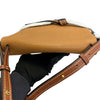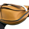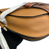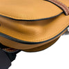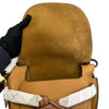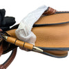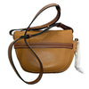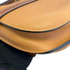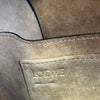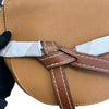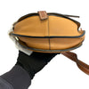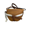 This is an authentic Loewe Small Gate Crossbody Calfskin in Brown. The stylish crossbody is made of textured calfskin leather. The bag has a shoulder strap and a front knotted detail that secures the flap. The gold hardware adds an elegant touch. The flap opens to reveal a beige suede interior with a small patch pocket.