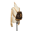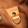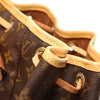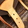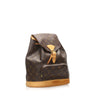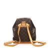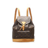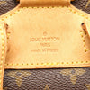 The Montsouris MM features a monogram canvas body, a front zip pocket, flat back straps, a front flap with a belt buckle detail, and a top drawstring closure.
