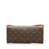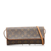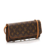 The Louis Vuitton Pochette Twin GM features a monogram canvas body, a flat leather strap, a front flap with a magnetic closure, and an interior slip pocket.