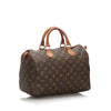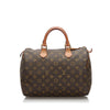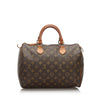 The Louis Vuitton Monogram Speedy 25 Brown features a monogram canvas body, rolled leather handles, a top zip closure, and an interior slip pocket.