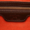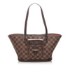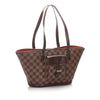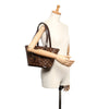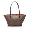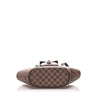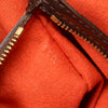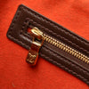 This bag is crafted of signature Louis Vuitton damier patterned toile canvas and reinforced with chocolate brown leather shoulder straps and polished brass hardware. The handbag has a sturdy flat bottom and an inverted pyramid shape with sides that widen towards the top and a front pocket. The top is open to an orange microfiber interior with zipper pockets. This is an excellent everyday bag with the right touch of luxury and style.