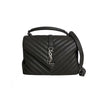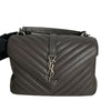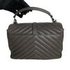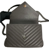 This Saint Laurent Medium College bag in grey is a fierce fashion statement for the fashion-forward. This stunning bag features quilted leather with the signature interlaced YSL logo in ruthenium hardware on the front flap. It also features a top handle as well as a removable chain and leather strap that allows for either shoulder or top handle wear. The interior features two compartments separated by a zippered pouch as well as a one card slot, plenty of room for all of your essentials. Add a bold edge to your most basic outfit.