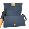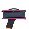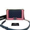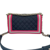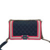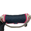 This stylish Chanel Boy bag is crafted from ca cad quilted fabric with a linear tripped border in pink and acrylic CC push lock. Make your travels and bag essentials organized and stylish with this elegant and timeless piece.