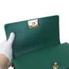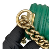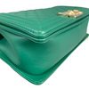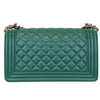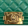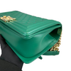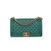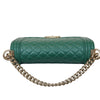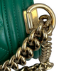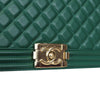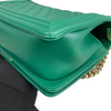 This Chanel Old Medium Le Boy Bag festures soft diamond quilted lambskin leather in a luxurious Green colour adorned with the CC Pinch clasp in gold hardware. This beauty also features the chunky chain in matching hardware that can be worn long or short. The interior features one spacious compartment for all of your necessities as well as a smaller side pocket. Don't miss your chance to own this classic beauty.