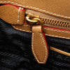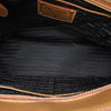 This handbag features a denim body with leather trim, rolled leather handles, an open top, and interior zip and slip pockets.