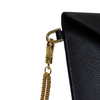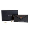 This is an authentic Prada Saffiano Leather Envelope Wristlet Clutch in Black. This chic wallet is crafted of Prada signature Saffiano cross grain leather in black. This wallet boasts a sleek, waist-length chain in a polished gold tone, complemented by a leather wristlet and a front-facing flap. Upon opening, the wallet reveals a leather interior adorned with card slots.