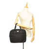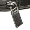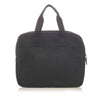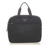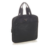 This business bag features a nylon body with leather trim, an exterior front zip pocket, flat leather handles, a top zip closure, and interior zip and slip pockets.