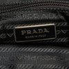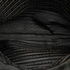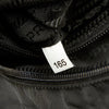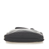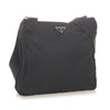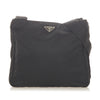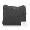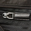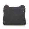 This crossbody bag features a nylon body with leather trim, an adjustable flat strap, a top zip closure, and an interior zip pocket.