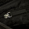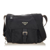 Prada Tessuto Crossbody Bag Black. This crossbody bag features a nylon body with leather trim, an exterior front zip pocket, an adjustable flat strap, a front flap with zip pocket and buckle closure, a top zip closure, and an interior zip pocket.