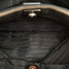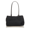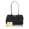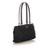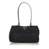Prada Tessuto Shoulder Bag Black. This shoulder bag features a nylon body, flat leather straps, a top zip closure, and an interior zip pocket.