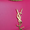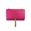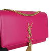 This is an authentic Saint Laurent Kate Tassel Medium Calfskin in Pink. This stylish bag is made of smooth calfskin leather in pink. The bag features a gold bijoux chain shoulder strap and a frontal flap with a gold YSL logo and a hanging miniature chain tassel. The flap opens to a suede interior with a small patch pocket.