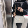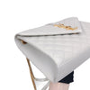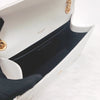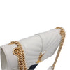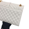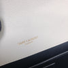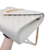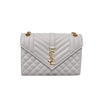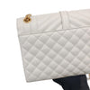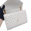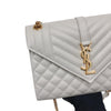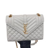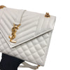 This Saint Laurent Medium Envelope White GHW bag is a stunning addition to your wardrobe. This beauty features a front flap adorned with the signature interlaced YSL initials in Gold Toned Hardware, a silver chain and leather strap, and beautiful calfskin leather in both chevron and diamond quilted stitching. The interior features a one slot pocket perfect for all of your essentials.