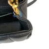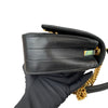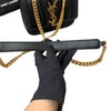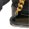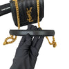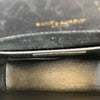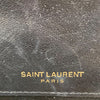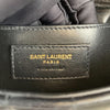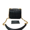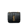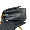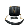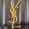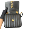 The Saint Laurent Medium Vicky shoulder bag features a raised signature YSL plaque on the front flap. The bag also features a square lambskin quilted body, gold toned chain link shoulder strap with a leather shoulder pad. The interior of the bag is lined with black leather with a patch pocket.