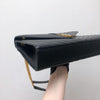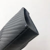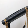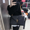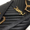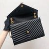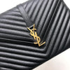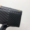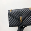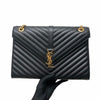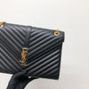 This Saint Laurent Large Envelope bag features a front flap adorned with the brand's signature interlaced YSL initials in Gold-Toned Hardware, a gold chain, and leather strap, and beautiful grained calfskin leather with chevron-quilted stitching.  The interior features a zippered pocket perfect for all of your essentials.