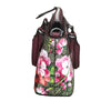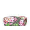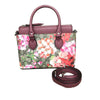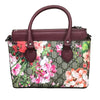 The Gucci GG Blooms satchel features a printed coated canvas body with leather trim, rolled leather handles, a detachable flat leather strap, a top zip closure, and interior zip and slip pockets.