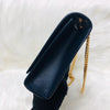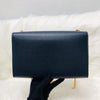 This YSL Monogram Kate Satchel made from grained leather and features a gold chain-link shoulder strap with a gold YSL logo on the flap, yellow gold hardware, and snap closure.