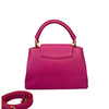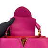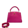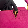 The Louis Vuitton Capucines BB is the perfect chic city bag for day-to-night socials. It is fashioned from full-grain Taurillon leather and has a calfskin leather interior lining. it has an elegant top handle trademark feature attached by silver-studded detailed rings and enclosed with a distinctive flap which can be displayed in two ways: outside to reveal a Monogram Flower motif, or inside to display the leather-wrapped “LV” emblem.