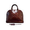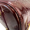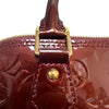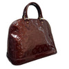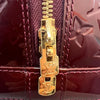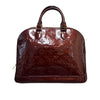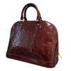 This is an authentic Louis Vuitton Alma PM Vernis Patent in Rouge Fauviste GHW. This is a chic small Alma made of Louis Vuitton monogram embossed vernis patent leather. The handbag features rolled leather top handles, gold tone hardware. The wrap around zipper opens to a matching fabric interior with a patch pockets.