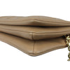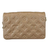 This is an authentic Louis Vuitton Coussin Pochette Lambskin Embossed Monogram in Camel. This supple shoulder bag, crafted from puffy beige lambskin, bears an embossed Louis Vuitton monogram. It can be carried as a clutch or with the gold hardware Edge Chain strap. The front flap reveals a navy blue microfiber interior featuring zipper and patch pockets.