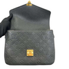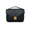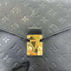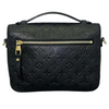 This is an authentic Louis Vuitton Empreinte Pochette Metis in Black. This chic shoulder bag is expertly made from timeless monogram empreinte leather in black. It boasts a top handle, an adjustable leather shoulder strap, and gleaming gold hardware. The front of this crossbody opens to a partitioned grey striped fabric interior.