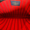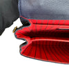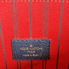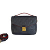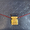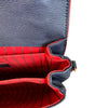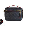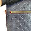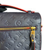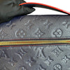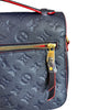This is an authentic Louis Vuitton Empreinte Pochette Metis in Navy Blue. This handbag is crafted of navy blue calfskin leather embossed with the Louis Vuitton monogram and trimmed with red resin glazing. It boasts a rear zipper pocket, a navy leather top handle, and a detachable shoulder strap with gold hardware. The flap opens to reveal a red striped interior with partitions.