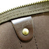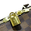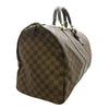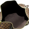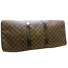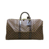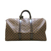 The Louis Vuitton Keepall 50 features a monogram canvas body in Damier Ebene leather, rolled leather handles, and a top zip closure.