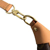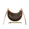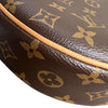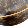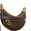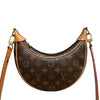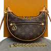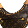 This is an authentic Louis Vuitton Loop Shoulder Monogram in Brown. This bag is crafted of Louis Vuitton monogram toile canvas in a simple half moon shape . It features natural vachetta cowhide leather piping and an adjustable shoulder strap. A zipper opens the bag to a matching microfiber interior with a patch pocket.