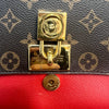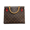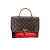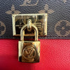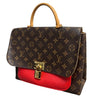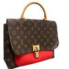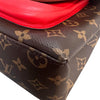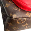 This is an authentic Louis Vuitton Marignan Coquelico Monogram Canvas in Brown and Red. This stylish Louis Vuitton handbag is made from monogram canvas and features a red leather front pocket. It includes a vachetta leather top handle, an adjustable shoulder strap, and gold-tone hardware. The flap opens to reveal a brown microfiber interior with convenient patch pockets for easy organization.